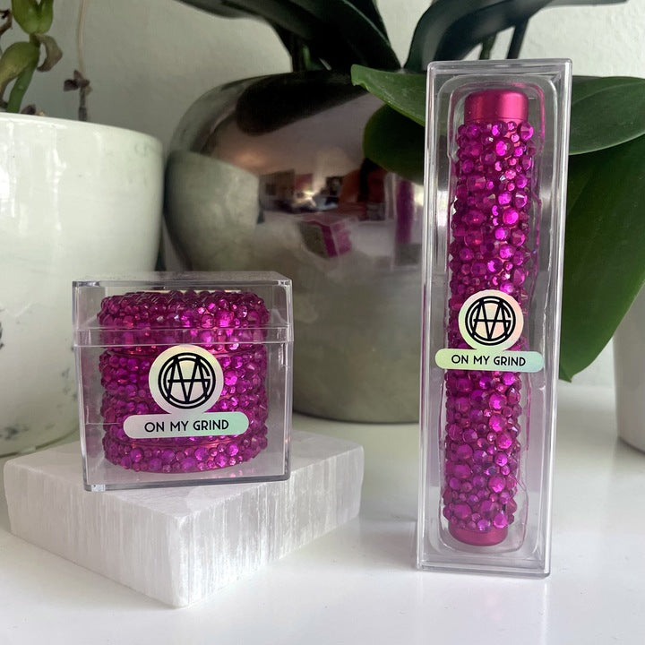 Keep it cute and coordinated with our Barbie Girl set, which includes a matching 4 piece 40mm grinder and airtight joint tube, handcrafted with hot pink stones on an aluminum hot pink base.