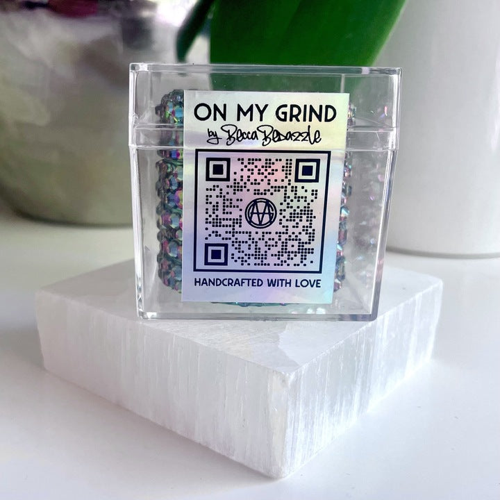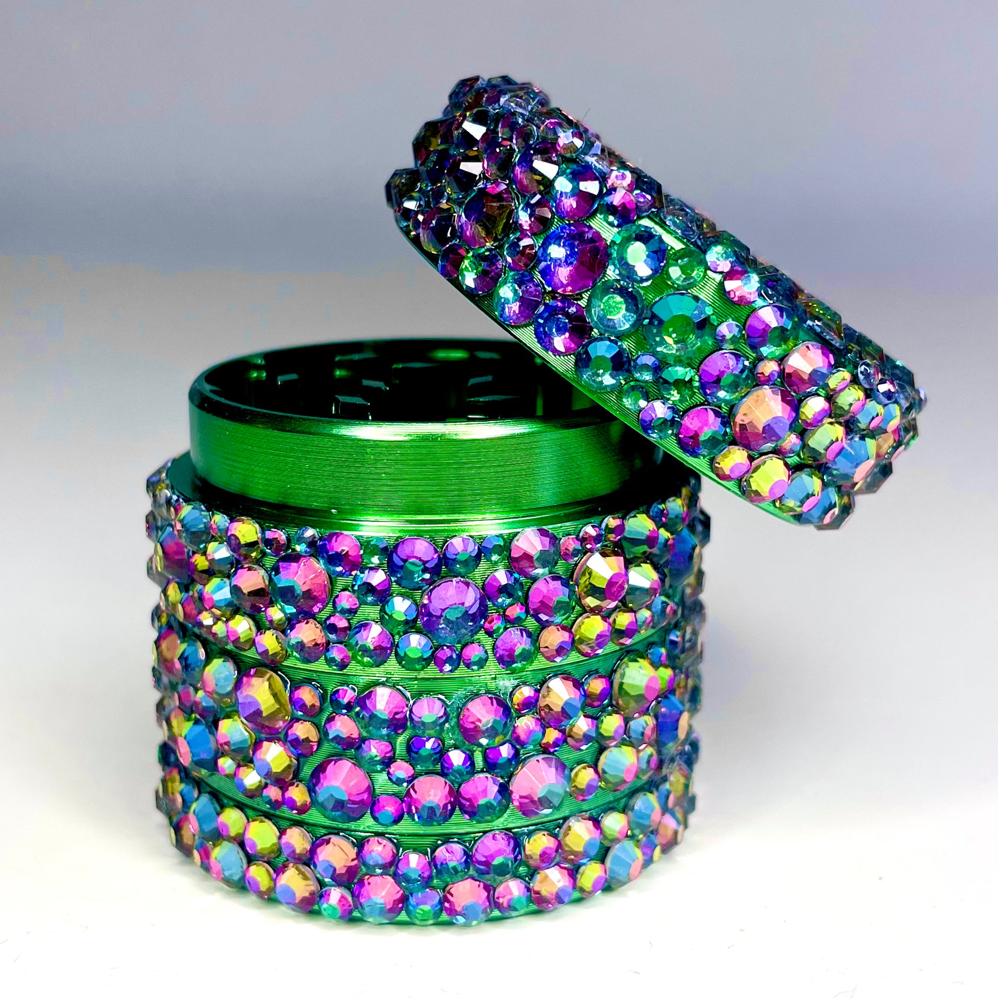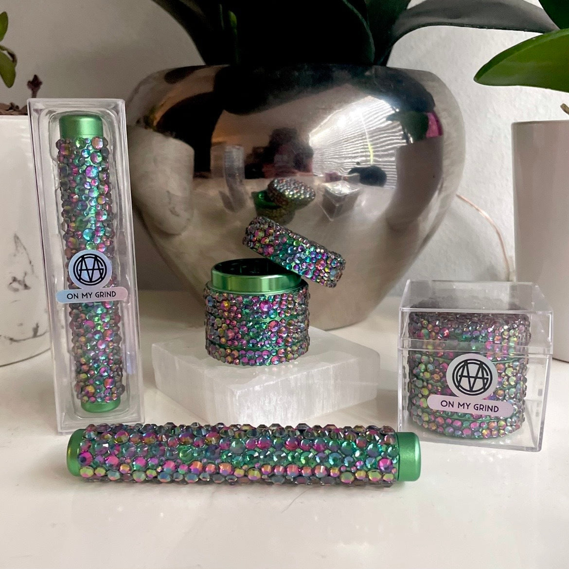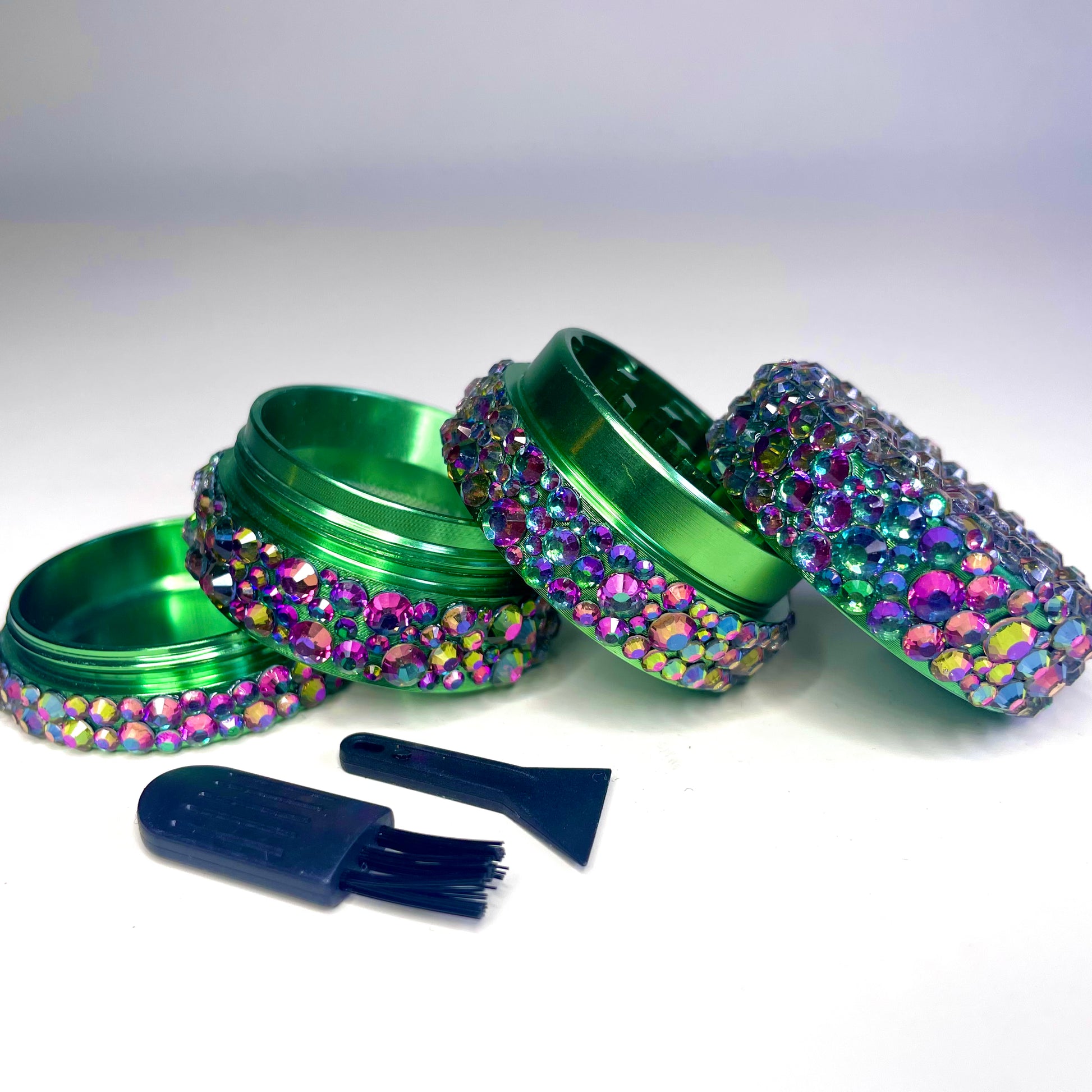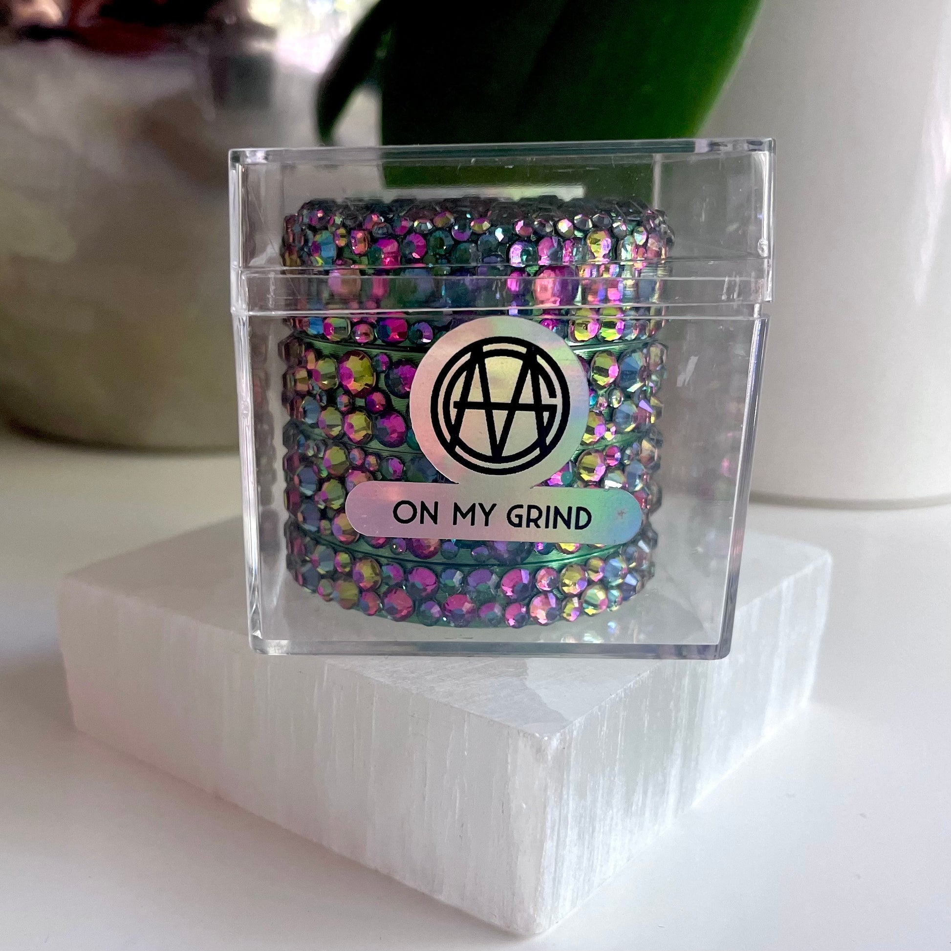 Handcrafted by individually placing iridescent stones on top of a custom dyed aluminum base, this 4-piece grinder features sharp teeth to cut through sticky flower, a fine mesh net to separate and save kief for later, and a strong magnetic closure to keep everything right where it’s supposed to be.